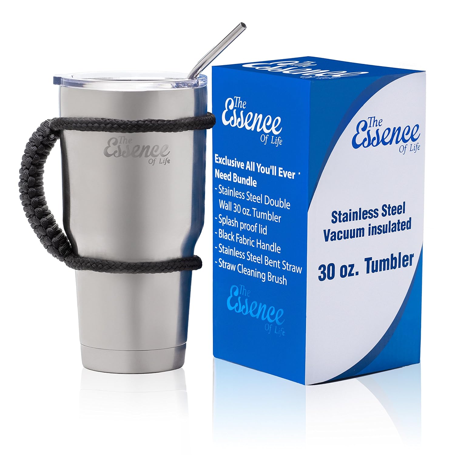 Stainless Steel 30oz Tumbler Double Wall Vacuum Insulated Cup with Fabric Handle, BPA Free Splash Proof Lid ,Bent Straw & Cleaning Brush for Hot & Cold Beverages By The Essence Of Life is best for youWe “The Essence of Life” came up with an innovative Stainless Steel Tumbler to enhance your drinking experience while you are working or on the go. With “The Essence of Life” Travel Tumbler you can enjoy water or your favorite smoothies, iced tea, morning coffee, juices and lemonades fresh and delicious with every sip. It is crafted using high-quality, food grade 18/8 304 stainless steel and its double-walled, vacuum insulated, anti- condensation design keeps your cold drinks frigid and hot drinks bubbling. With 30 Oz large capacity you need not to go here and there for frequent refills and you can hold the tumbler safely without feeling any moisture, heat or cold. ”The Essence of Life” ALL-IN-ONE tumbler pack has a paracord fabric handle (which will not brake like the plastic ones), a spill proof crystal clear lid to gauge the level of your drinks, a beautiful stainless steel straw to sip from, and a straw cleaning brush to get the straw cleaned. Best of all, our travel mugs are BPA free, flavor free, reusable, and easy to clean. So, click on the orange colored “ADD TO CART” Button on the top of this page and start travelling or working with style. Or else, make a memorable gift for your love! For any reason, if you're not 100% satisfied with your investment, we will refund 100% of your money, no questions asked! You're protected by this guarantee for life!