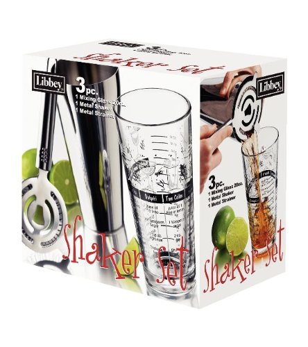 Libbey Shaker Glass Set, 3-Piece is best for youThese tools provide the basics, whether you are a novice or a pro, for making perfect drinks at your next party. Each set includes one 20 ounce mixing glass, one stainless steel shaker, and one stainless steel strainer. This is a great bachelor, wedding, housewarming, or host gift, as well as an excellent addition for the home bartender connoisseur. The glass is dishwasher safe and made in the USA. Stainless steel shaker and strainer are made in India and hand washing is recommended.