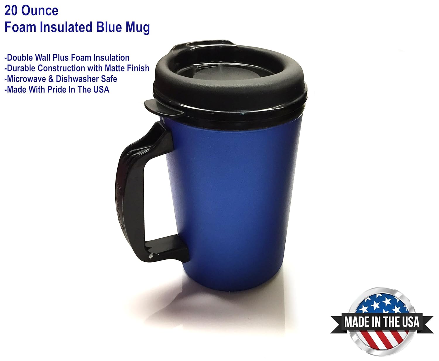 20 oz ThermoServ Foam Insulated Coffee Mug- Pearl Dark Blue is best for youA good coffee mug is like a comfortable pair of Jeans or your favorite boots - it just feels 'right'. For years the 20 oz mug was available at most Gas Stations and Convenience Stores. A few years ago they suddenly disappeared from the market and haven't been seen since. Well, we found the mold and arranged for a special production run of mugs. The ThermoServ mugs are great. They are double wall insulated and unlike other mugs on the market, they are foam filled so they are far superior at keeping drinks hot or cold. These rugged mugs are both dishwasher and microwave safe. The lid snaps on tight and doesn't leak out the sides like most of the Chinese imports! This listing is for one blue mug with a black top. There is no printing or graphics on this mug.