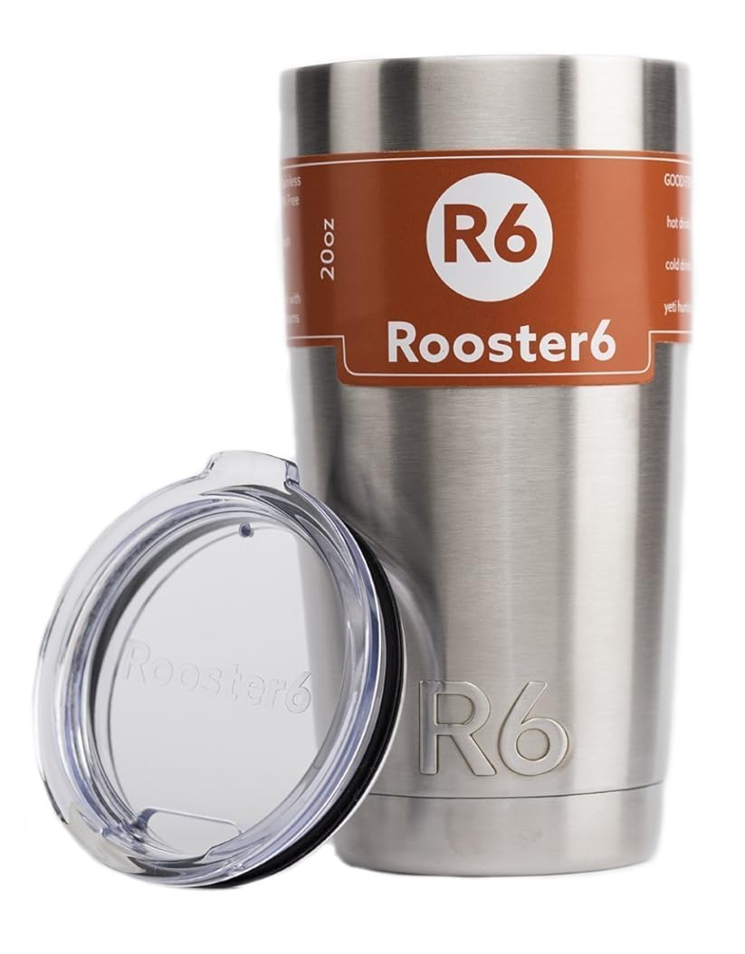 Rooster6, 20 ounce Stainless Steel Tumbler w/Lid, BPA Free, R6 is better than Yeti, RTIC, and Ozark Trail. is best for youThe Rooster6 20oz Stainless Steel Tumbler is made from kitchen grade 18/8 stainless steel and keeps your ice cold beverage at the perfect, refreshing temperature all day long in this BPA-free cup of pure bliss. But wait! How about that piping hot coffee you poured in while dashing out the door to your 9-5? Don't worry, it will be hotter than a camel's toe at a Labor Day BBQ when you arrive to fill out the TPS reports. Pour in. Relax. Enjoy.