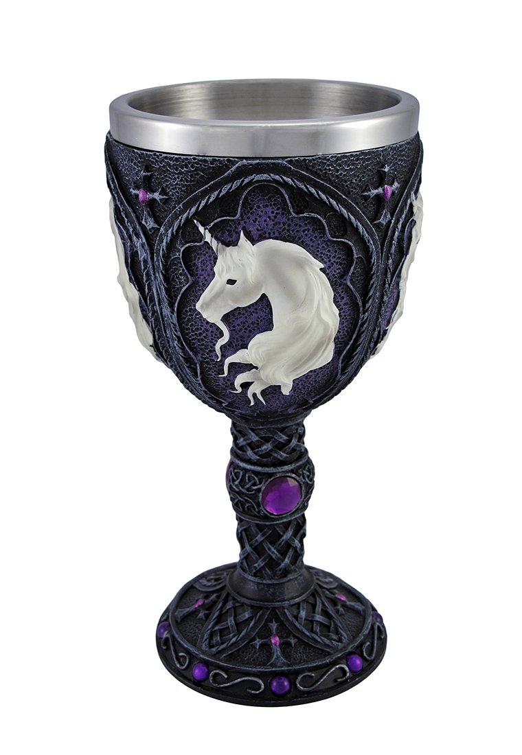 Medieval Renaissance Wine Goblet Gemstone Chalice Cup (Unicorn - Purple) is best for youThis medieval style drinking goblet has Celtic knot work patterns and images of a white unicorn head against a purple pebble grain background. The goblet has a wonderful stone-like texture and is accented by faceted purple stones on the stem and smooth cabochon stones around the base. The stainless steel inner liner keeps your drink cool and is easy to clean. The goblet measures 7 1/2 inches tall, 3 3/4 inches in diameter, and holds 6 ounces of your favorite beverage. It is made of cold cast resin and is recommended to wash by hand.