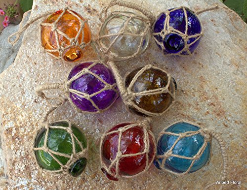 Set of 8 ~ 2" Glass Fishing Buoys 8 Assorted Colors Roped Net Floats Buoy is best for youEight Glass Floating Buoys ~ Roped Nautical Ball Bouy. Beautiful by the Pool.. Use them inside or out. Netting in natural jute roping holds the ball for hanging if you wish. Eight individual hanging netted buoys. One of each color, Orange, Clear, Colbalt Blue, Purple, Amber, Green, Red and Aqua Marine. Total String Measures 5'. Each glass globe is 2' across.