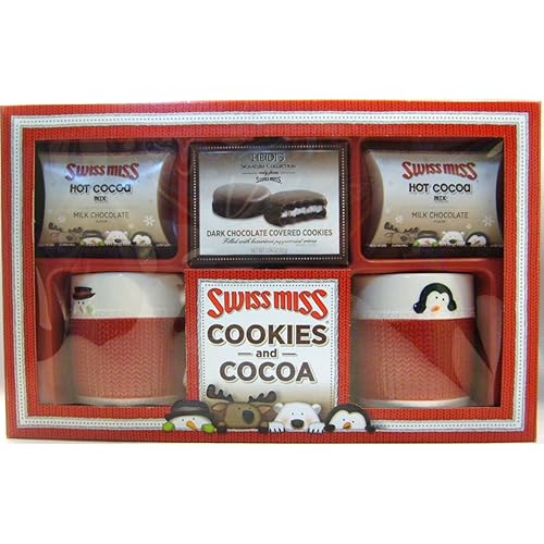 Swiss Miss Cookies & Cocoa Gift Set is best for youThis great gift set comes with everything you need for a night of cookies and cocoa for two. Two holiday mugs and hot chocolate mix to match, and a pack of dark chocolate peppermint creme filled cookies.