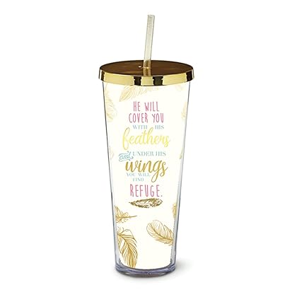 He Will Cover You Under His Wings Find Refuge Feathers Gold Lid 24 oz. Double-Walled Straw Tumbler is best for youThis inspirational straw tumbler is perfect for on-the-go! Fits perfectly in most car cup holders, it is made for hot and cold drinks. Fill with hot chocolate on a cold winter day or take it to the pool in the summer. This dual-walled travel mug fits perfectly in most cupholders.