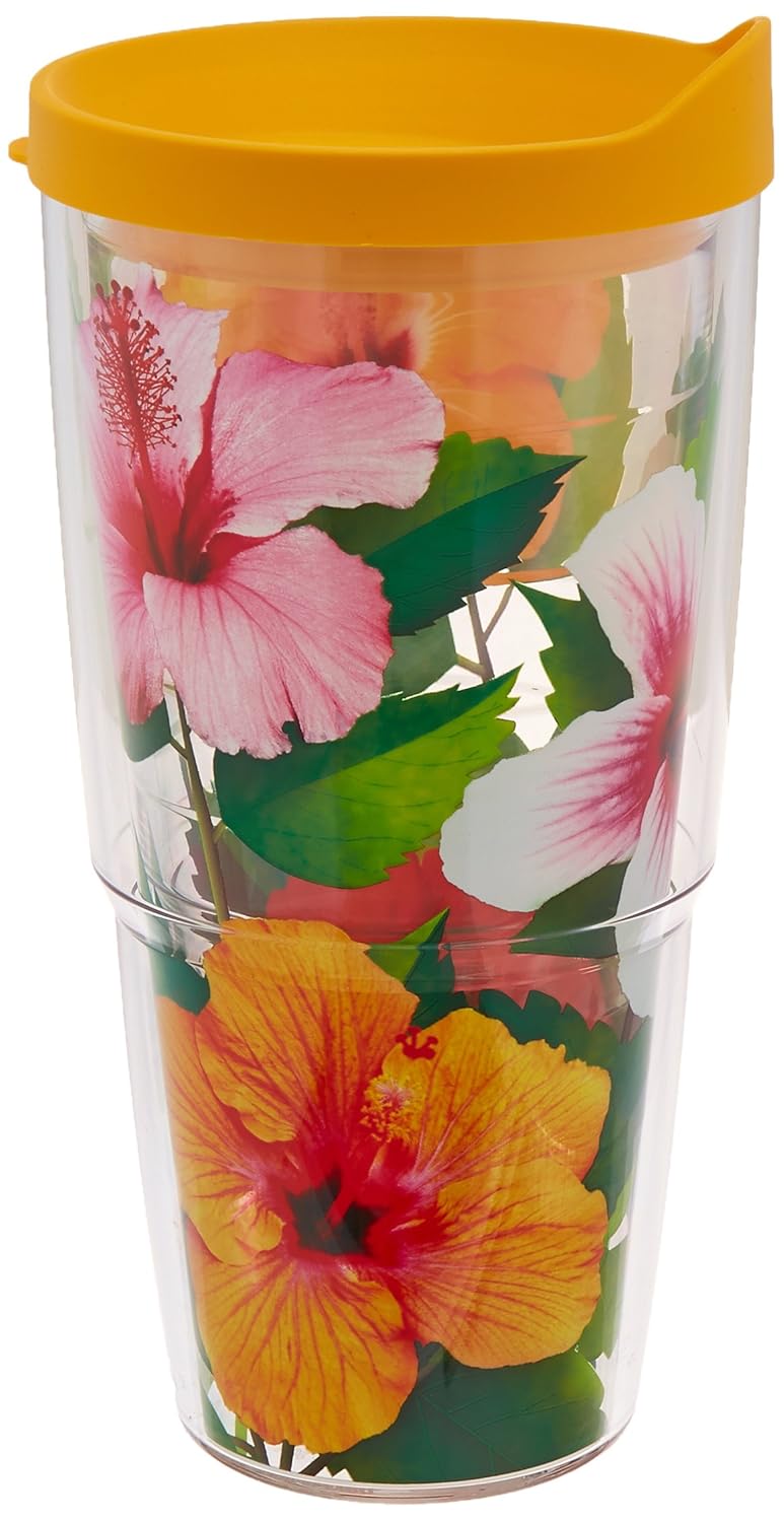• The Tervis Hibiscus Wrap Tumbler with Yellow Lid, 24-Ounce is a