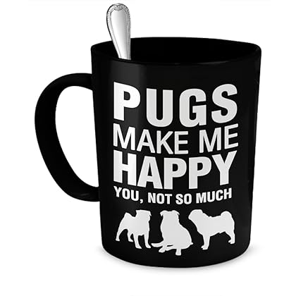 Chef's Star can be used to pay homage to this special / traditional cocktail. It is also perfect for enjoying any cold beverage from water and iced tea, all the way down to other cocktails and a nice beer.the Pug Mug - Pug Coffee Mug - Pugs Make Me Happy - Pug Gifts colster, part of our rambler series, represents the next evolution in can-insulating, hand-protecting technology. All the powers of modern science were brought to bear on this drink insulator to keep the contents of your 12 oz can or bottle chilled, including double-wall vacuum insulation and a thermoLock gasket that locks in the cold. The heavy-duty stainless steel walls are sweat-proof, so you can high-five with impunity while enjoying a tasty beverage.No longer worry about dainty wine stems. Our stemless base provides stability and eliminates the risk of stem breakage that is so common among tradition wine glasses.Pug Mug - Pug Coffee Mug - Pugs Make Me Happy - Pug Gifts is best for youPug Mug - This is the perfect Mug - Your gift search is now over! Bring the smiles with this Pug Coffee Mug. It’s great for your home and makes a very thoughtful gift. When it’s cold outside, drink tea, coffee, or hot chocolate out of it. When it’s hot, drink iced coffee, iced tea, lemonade, or even booze - we’re not judging! Some people use their mugs to do even more than drink liquids - we know people who put plants in them, put them on their desks, and even make DIY candles. They love what the mugs say and they want to display them. We know - who would have thought a mug could be so versatile!? THIS MUG MAKES AN AWESOME GIFT!! The thing is, this isn’t just a mug - it’s a statement. You’re giving someone a very thoughtful, custom-tailored-to-their-personality gift. Someone will feel very special to be the recipient of your thoughtful gift, and a perk for you is that you don’t have to break the bank to make that happen. You can also rest assured that this Pug Gifts Mug is VERY high quality. You (or your gift recipient!) will be able to wash and re-wash your mug over and over without worrying about the image dulling. It’s made of a high quality ceramic that is both dishwasher and microwave safe. SPECIAL SALE RIGHT NOW This mug is normally $19.95. If you see a cheaper price, you're in luck. Order now to ensure the best possible price. And with Amazon’s quick shipping, you’ll get this quickly. In just a few days, you (or he or she) could be happily using your brand new mug. READY? ADD TO CART NOW - Get this to your/their door on time!