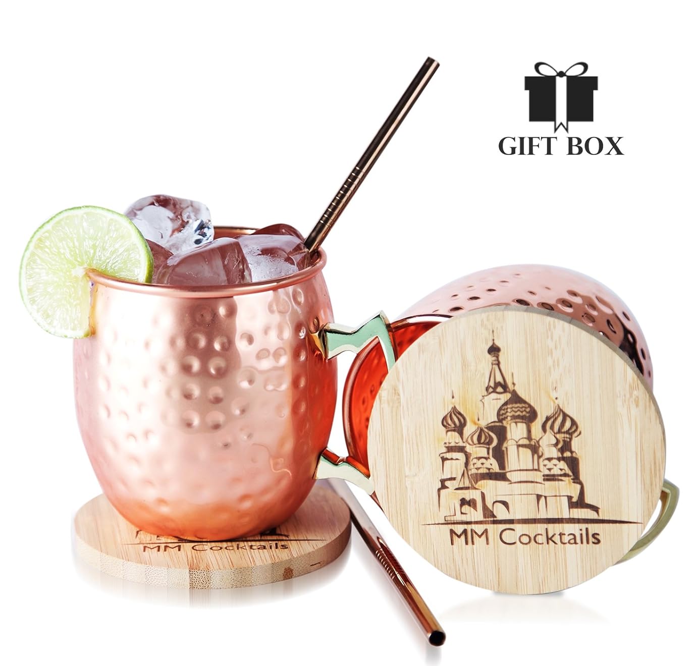 Chef's Star can be used to pay homage to this special / traditional cocktail. It is also perfect for enjoying any cold beverage from water and iced tea, all the way down to other cocktails and a nice beer.the Moscow Mule Mugs - Gift Box Set 2 Pack Cups with FREE Coasters + Copper Straws - Handcrafted Copper Hammered 16oz Classic Mugs - MM Cocktails colster, part of our rambler series, represents the next evolution in can-insulating, hand-protecting technology. All the powers of modern science were brought to bear on this drink insulator to keep the contents of your 12 oz can or bottle chilled, including double-wall vacuum insulation and a thermoLock gasket that locks in the cold. The heavy-duty stainless steel walls are sweat-proof, so you can high-five with impunity while enjoying a tasty beverage.No longer worry about dainty wine stems. Our stemless base provides stability and eliminates the risk of stem breakage that is so common among tradition wine glasses.Moscow Mule Mugs - Gift Box Set 2 Pack Cups with FREE Coasters + Copper Straws - Handcrafted Copper Hammered 16oz Classic Mugs - MM Cocktails is best for youWhat is a Moscow Mule? A Moscow mule is a cocktail that was introduced in America in the 1940’s. Since those times this classic drink has become more and more known and popular. Today, it is the #1 trending cocktail in the market. You can now too be part of the trend and experience the true authentic way of drinking the Moscow Mule Cocktail with our premium Copper Mug set. How can you make the perfect Original Moscow Mule Drink? For that fresh and ice cold sensation, put your Copper Mugs in the freezer for 5 minutes. Then, simply, add lime juice, ice cubes, vodka, ginger beer into the mug and garnish with a lime wedge and mint, finally stir with our Copper Straw and set on the Wooden Coasters provided and you are ready to serve this delicious cocktail in your Copper mugs. Ingredients: (Per Serving) ½oz Lime Juice 2oz Vodka 5oz Ginger Beer 1 Lime Wedge 2 Fresh Mint Leaves 2 – 3 Ice Cubes 1 Chilled Copper Mug ENJOY!! How do you care for your Copper Mugs? To extend your products life cycle, it is recommend to follow the follows steps for best results: 1. Hand wash mugs and straws with soap and warm water after each use 2. Towel dry or leave to air dry on the counter 3. DO NOT place mugs in the dishwasher or microwave Buy with Confidence: MM Cocktails stands by its product, and wants its customers to have the best experience. Our main goal is to provide our customers with 100% satisfaction. If for any reason you don’t completely love your Copper Mug set, simply return them for a full refund. If you have any questions regarding the product, please contact us anytime and we will be happy to assist you.